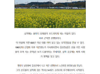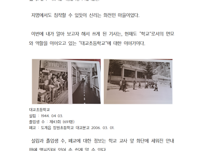 활동기록 삼척시 주민기록단의 다양한 활동을 확인하세요. 페이지. 1 게시물. 총 13 건 검색대상 제목내용제목+내용 검색어 필수 [제1회 삼척시UCC 영상공모전-우수상]The 아름답고 Wonderful한 삼척 The 아름답고 Wonderful한 삼척 2022-04-27 1968년 어느 가을 날 [주민활동가 김순희] 2026-03-11 궁촌의 노래 '난봉가' [주민활동가 정경진] 2026-03-09 대교 초등학교의 어제와 오늘 [주민활동가 김순희] 2026-03-09 토착민이 들려주는 상맹방 이야기 [주민활동가 강은빈] 1)디지털삼척문화대전 삼척향토문화백과, <남양홍씨 교수공파 종가>,https://samcheok.grandculture.net/samcheok/toc/GC06700506.. 2026-03-09 "80세 노부부, 참새 방앗간을 지키다."[주민활동가 박선영] 인심좋고 살기좋은 하맹방2리 “방림, 연봉”마을 입구에 들어서면 작은 돌판에 씌여져 있는 마을길을 따라 첫 입구에 들어서고, 바로 보이는 곳이 “하맹방 정미소” .. 2024-12-23 목록 1페이지 2페이지 3페이지 맨끝