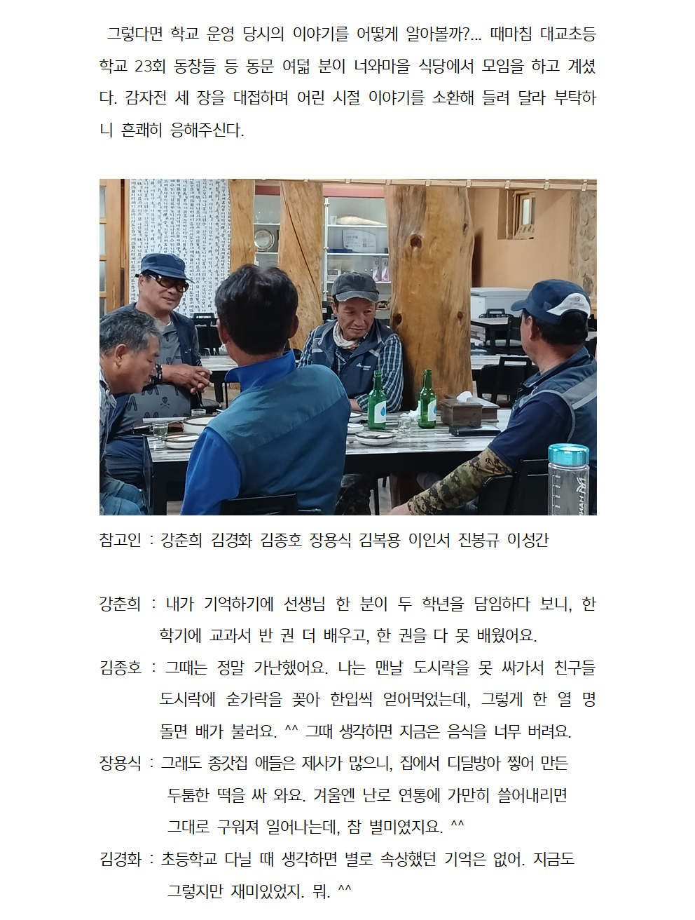 활동기록 삼척시 주민기록단의 다양한 활동을 확인하세요. 대교 초등학교의 어제와 오늘 [주민활동가 김순희] 페이지 정보 작성자 곡세준 조회 16회 작성일 26-03-09 13:43 목록 본문 관련링크 http://www.scarchive.or.kr/g5/data/editor/2603/889d621a75cec0134782278… 12회 연결 이전글궁촌의 노래 '난봉가' [주민활동가 정경진] 26.03.09 다음글토착민이 들려주는 상맹방 이야기 [주민활동가 강은빈] 26.03.09